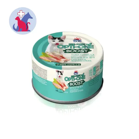 OPTI ONE BOOST CAT FOOD TUNA WITH CHICKEN & SEAFOOD STICK merupakan makanan basah untuk kucing dengan varian rasa ikan tuna yang dikombinasikan dengan daging ayam dan seafood.
