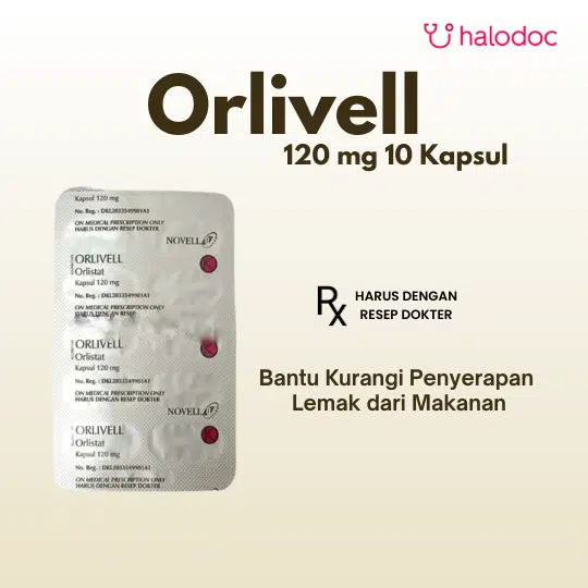 Orlistat 120 mg Tablet digunakan untuk membantu menurunkan berat badan pada penderita obesitas dengan cara menghambat enzim lipase di saluran cerna sehingga mengurangi penyerapan lemak dari makanan, dan lemak yang tidak diserap akan dikeluarkan melalui feses. Obat ini diminum 120 mg tiga kali sehari bersama makanan utama yang mengandung lemak, atau dalam waktu satu jam setelah makan. Efek samping yang dapat muncul meliputi feses berminyak, sering buang air besar, nyeri perut, dan penurunan penyerapan vitamin A, D, E, serta K, sehingga disarankan mengonsumsi suplemen multivitamin dua jam sebelum atau sesudah minum obat. Gunakan dengan hati-hati pada pasien dengan gangguan penyerapan atau kolestasis, serta hindari penggunaan pada ibu hamil dan menyusui. Efektivitas obat meningkat bila disertai pola makan rendah kalori dan olahraga teratur.