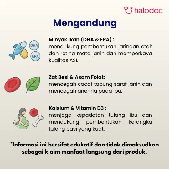 Thiamine HCl 0,52 mg, Riboflavin 0,75 mg, Niacinamide 7,5 mg, Pyridoxine HCl 0,91, Cyanocobalamin 0,05 mg, Folic Acid 0,4 mg, Ascorbic Acid 30 mg, Cholecalciferol 400 IU, d-alpha tocopherol 5,21 IU, Beta-carotene 10.000 IU, Ferrous fumarate 90 mg, Calcium carbonate 250 mg, Potassium iodide 0,098 mg, Magnesium oxide heavy 49,8 mg, Zinc Oxide 9,34 mg, Fish oil 250 mg mengandung DHA 67,5 mg dan EPA 12,5 mg