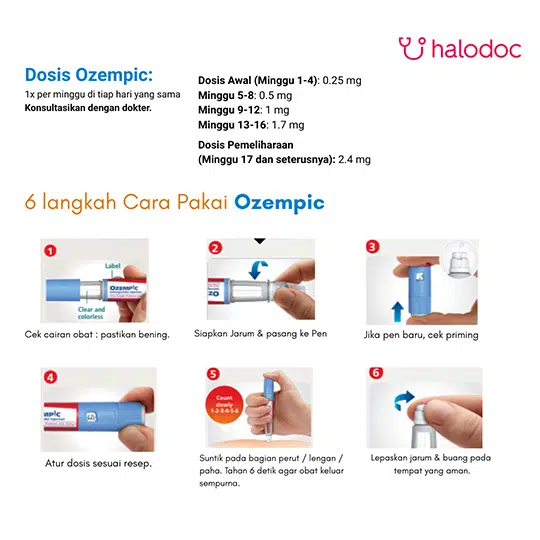 - Dosis Peningkatan & Pemeliharaan: Setelah 4 minggu, dosis ditingkatkan menjadi 0.5 mg sekali seminggu. Jika kontrol gula darah yang lebih baik masih diperlukan setelah minimal 4 minggu menggunakan dosis 0.5 mg, dokter dapat meningkatkan dosis menjadi 1 mg sekali seminggu.