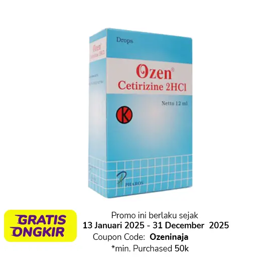 OZEN mengandung cetirizine hidroklorida, suatu agen antihistamin generasi kedua yang mekanisme kerjanya melibatkan antagonisme selektif terhadap reseptor histamin H1 perifer. Indikasi penggunaan obat ini mencakup penanganan simptomatik berbagai manifestasi alergi, seperti rinitis alergi, baik musiman maupun perenial, yang ditandai dengan bersin, rinore, kongesti nasal, pruritus okular, dan lakrimasi. Selain itu, Ozen juga efektif untuk meredakan pruritus yang terkait dengan urtikaria kronis idiopatik. Dengan menghambat ikatan histamin pada reseptornya, cetirizine secara efisien mereduksi respons inflamasi alergi, memberikan pemulihan dari gejala-gejala tersebut dengan profil sedasi yang lebih rendah dibandingkan antihistamin generasi sebelumnya. Dalam penggunaan obat ini harus SESUAI DENGAN PETUNJUK DOKTER. Obat ini tergolong Obat Keras (HARUS DENGAN RESEP DOKTER). Dalam pembelian produk ini, Anda akan diarahkan untuk melakukan sesi edukasi singkat dengan Dokter kami mengenai penggunaan yang tepat dan aman. Sesi ini akan dikenakan biaya layanan.