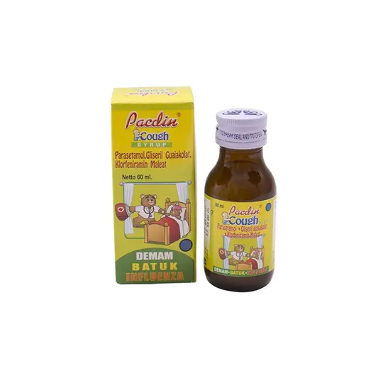 PACDIN COUGH SIRUP 60 ML mengandung Paracetamol, Glyceryl guaiacolat dan Chlorpheniramine maleat. Obat ini digunakan untuk mengatasi gejala flu seperti demam, sakit kepala, bersin-bersin, hidung tersumbat yang disertai batuk berdahak.
