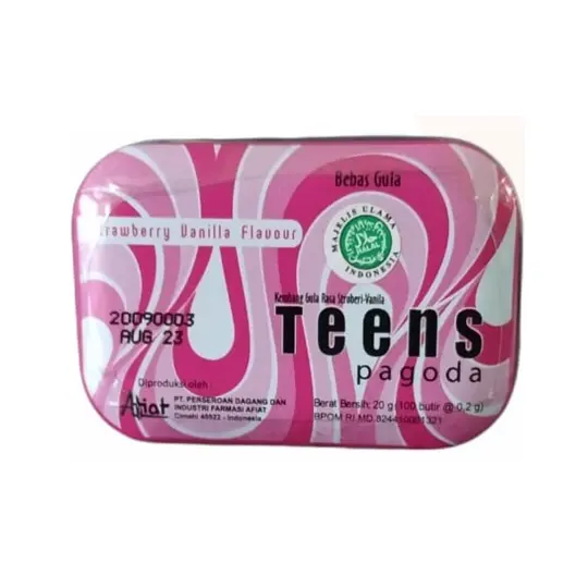 Pagoda Teens Strawberry - Vanila 20 g merupakan permen yang bermanfaat untuk menyegarkan mulut dan pernapasan serta dapat membantu meredakan rasa gatal dan tidak nyaman di tenggorokan.