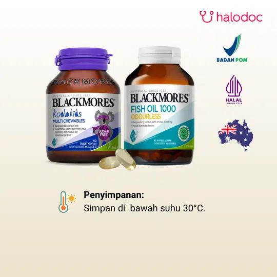 BPOM: SI174308231 (Blackmores Odourless Fish Oil 1000 90 Kapsul), SI214540131 (Blackmores Koalakids Multi Chewables 60 Tablet Kunyah).