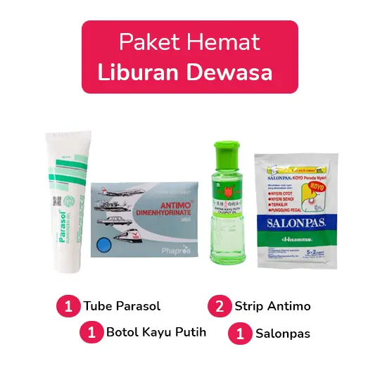 Paket Hemat Liburan Dewasa merupakan paket dengan rekomendasi obat, oil & balm serta sunscreen yang berguna dalam membantu kebutuhan liburan Anda.