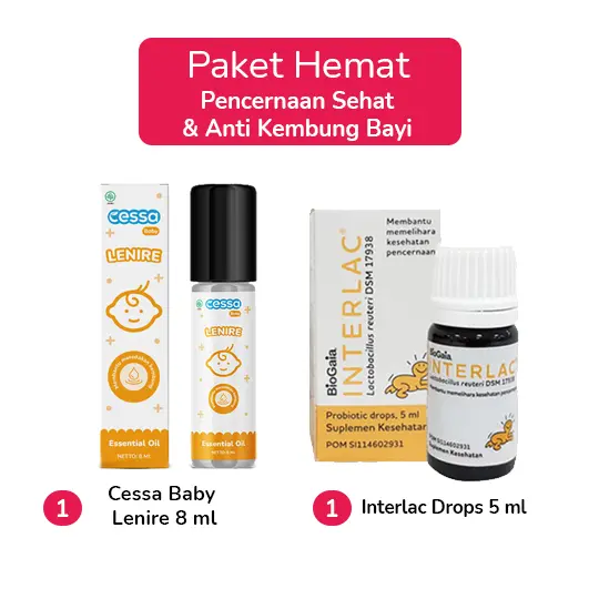 Paket rekomendasi obat ini terdiri dari: 1. Cessa Baby Lenire 8 ml Merupakan Essential Oil yang khusus diracik untuk membantu menenangkan bayi saat rewel atau nangis terus. Essential Oil berasal dari tumbuhan yang diekstraksi esensi atau manfaat terbaik dari tumbuhan tersebut dan diracik dengan berbagai kandungan bahan alami yang sangat aman untuk bayi, Dengan 100% Aroma Pure Therapeutic Grade Essential Oil akan membantu merelaksasi bayi sehingga bisa tenang kembali. 2. Interlac Drops 5 ml merupakan suplemen yang mengandung probiotik Lactobacillus reuteri. Suplemen ini digunakan untuk menjaga kesehatan fungsi pencernaan pada neonatus, bayi prematur, anak & dewasa.