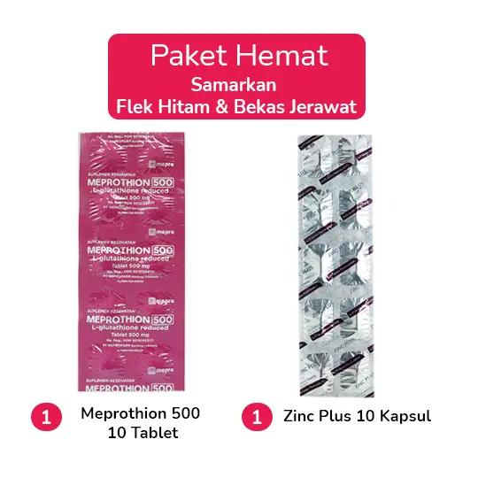 Paket rekomendasi ini terdiri dari: 1. MEPROTHION merupakan vitamin dengan kandungan L-glutathione yang berguna membantu menjaga kesehatan tubuh & kulit. 2. ZINC PLUS merupakan suplemen makanan dengan kandungan vitamin Zinc Picolinat, Zinc Gluconate, Cuprum Gluconate, Calcium ascorbat yang berfungsi untuk membantu memenuhi kebutuhan mineral seperti Zinc, Tembaga, dan Vitamin C.
