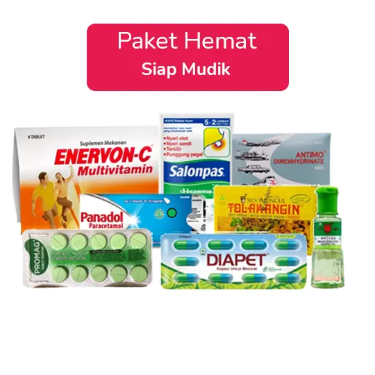 Paket rekomendasi ini terdiri dari: 1. Antimo: Dus, 72 Catch Cover @ 1 Strip @ 10 Tablet 2. Tolak Angin Cair Plus Madu 15 ml: Dus, 5 Sachet @ 15 ml 3. Panadol 500 mg: Dus, 10 Blister @ 10 Kaplet 4. Cap Lang Minyak Kayu Putih 30 ml: Dus, Botol @ 30 ml 5. Salonpas Koyo: Pack @ 10 Patch 6. Diapet: Dus, 10 Blister @ 10 Tablet 7. Promag: Dus, 3 blister @ 10 tablet kunyah 8. Enervon-C: Dus, 25 Catch Cover @ 1 Strip @ 4 tablet salut gula