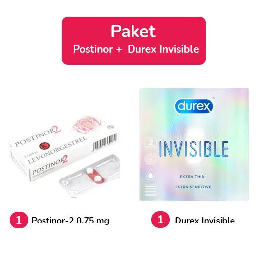 Paket ini menggabungkan Postinor-2 0.75 mg 2 Tablet, yang berfungsi sebagai kontrasepsi darurat oral, dengan Kondom Durex Invisible Extra Thin Isi 2.