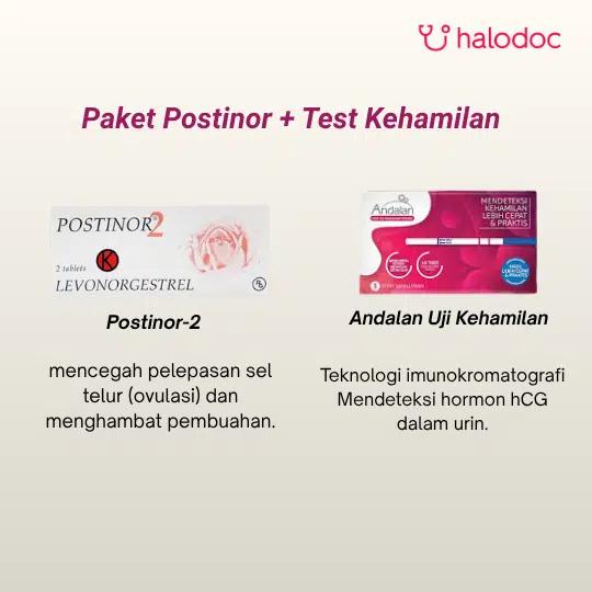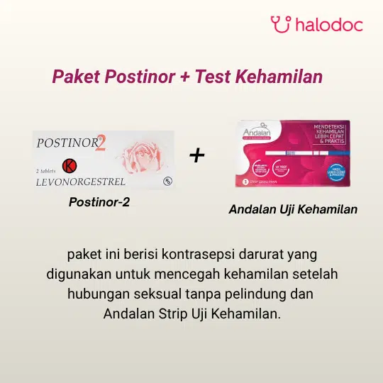 Paket ini menyediakan kombinasi produk yang relevan untuk situasi darurat yang membutuhkan pencegahan kehamilan. Paket ini terdiri dari Postinor-2 0.75 mg 2 Tablet dan Andalan Strip Uji Kehamilan.
