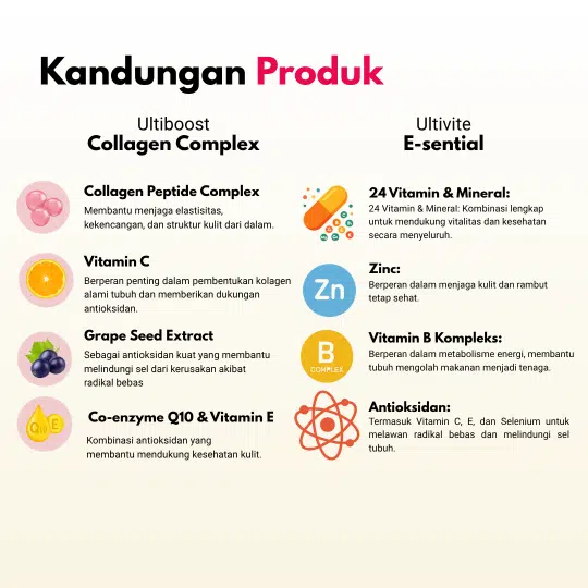 Swisse Ultiboost Collagen Complex mengandung Marine Collagen, Vitamin C, dan antioksidan untuk mendukung elastisitas dan kekencangan kulit. Swisse Ultivite E-sential adalah multivitamin dan mineral lengkap yang menyediakan nutrisi esensial untuk mendukung metabolisme energi, fungsi sistem kekebalan tubuh, dan kesehatan umum.