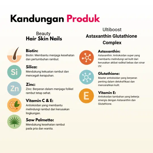 Paket ini adalah kombinasi suplemen yang dirancang untuk membantu memelihara kesehatan kulit dari dalam, serta menjaga kesehatan rambut dan kuku.