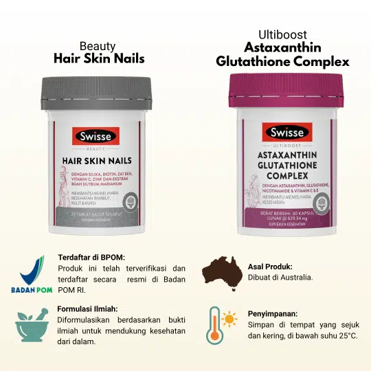 BPOM: SI235053291 (Swisse Beauty Hair Skin Nails 30 Tablet), SI243038901 (Swisse Ultiboost Astaxanthin Glutathione Complex 30 Kapsul)