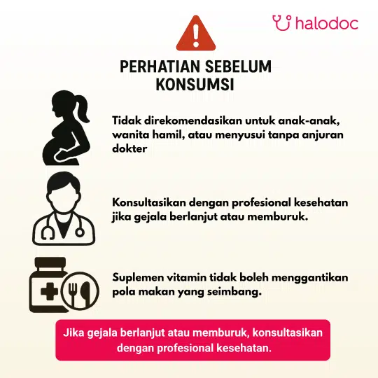 Jauhkan dari jangkauan anak-anak. Jika memiliki pertanyaan, silakan bertanya kepada dokter untuk mengetahui kesesuaian suplemen kesehatan ini, terutama bila digunakan bersamaan dengan suplemen lain. Suplemen vitamin sebaiknya tidak menggantikan asupan yang seimbang. Simpan pada suhu di bawah 30�C. Jangan digunakan bila segel rusak.