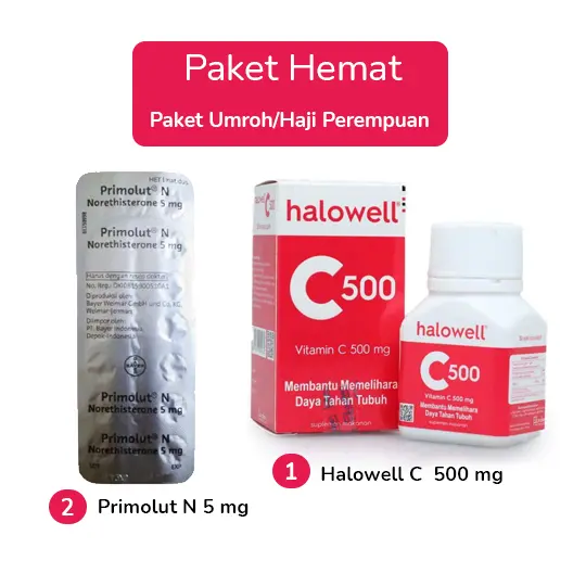 BPOM: DKI0815900510A1 (Primolut N 5 mg 15 Tablet), SD202554171 (Halowell C (Vitamin C) 500 mg 30 Tablet)