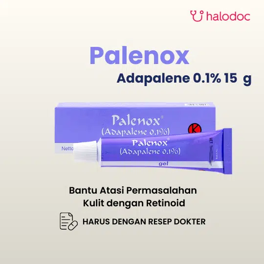Palenox 0.1% Gel 15 gr adalah sediaan topikal yang mengandung Adapalene. Adapalene adalah retinoid topikal yang digunakan untuk mengobati akne vulgaris. Obat ini bekerja dengan menormalkan diferensiasi sel epitel folikuler, sehingga mengurangi pembentukan mikrokomedo.