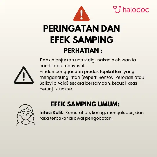 Efek samping yang mungkin terjadi dalam penggunaan obat adalah eritema (kemerahan), pengelupasan, kekeringan, pruritus (gatal), sensasi terbakar/terbakar, iritasi kulit, terbakar sinar matahari, dan flare akne.