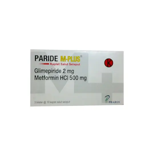 PARIDE M - PLUS merupakan obat anti diabetes kombinasi yang terdiri dari Metformin (antidiabetes oral golongan biguanid) dan Glimepiride (antidiabetes oral golongan sulfonilurea). Obat ini digunakan untuk pengobatan diabetes mellitus tipe 2. Paride M-Plus digunakan dengan diet dan olahraga, untuk mengobati DM Tipe 2 ketika penggunaan glimepiride atau metformin saja tidak menghasilkan kontrol glikemik yang adekuat. Obat ini juga digunakan sebagai pengganti terapi kombinasi glimepiride dan metformin. Dalam penggunaan obat ini HARUS SESUAI DENGAN PETUNJUK DOKTER. Pembelian obat ini memerlukan edukasi terkait penggunaan atau pengonsumsian obat yang tepat dan aman yang akan dikenakan biaya.