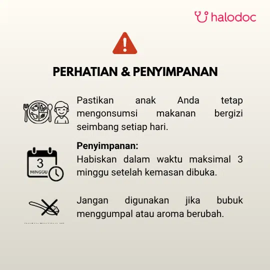 Sebagai dukungan nutrisi di antara waktu makan (sesuai kebutuhan). Lihat tabel untuk informasi nilai gizi. Sarankan untuk tidak melebihi batas saji maksimum. 2 saji untuk anak 1-3 tahun, 3 saji untuk anak 4-10 tahun. Tambahkan 5 sendok takar bubuk secara bertahap. Tuangkan air hangat/ dingin 190ml. menghasilkan minuman rasa vanila 230ml.