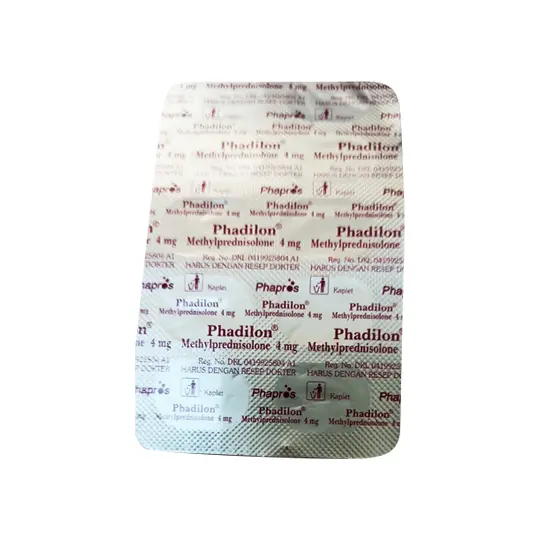 PHADILON 4 MG merupakan obat yang mengandung Methylprednisolon yang merupakan obat golongan glukokortikoid turunan prednisolon yang mempunyai efek kerja dengan cara mengikat dan mengaktifkan reseptor glukokortikoid intraseluler, reseptor glukokortikoid yang diaktifkan berikatan dengan daerah promotor DNA (yang dapat mengaktifkan atau menekan transkripsi) dan mengaktifkan faktor transkripsi yang mengakibatkan inaktivasi gen melalui deasetilasi histon. Obat ini diindikasikan untuk keadaan alergi dan mengurangi peradangan atau supresi inflamasi. Dalam penggunaan obat ini HARUS SESUAI DENGAN PETUNJUK DOKTER. Pembelian obat ini memerlukan edukasi terkait penggunaan atau pengonsumsian obat yang tepat dan aman yang akan dikenakan biaya.