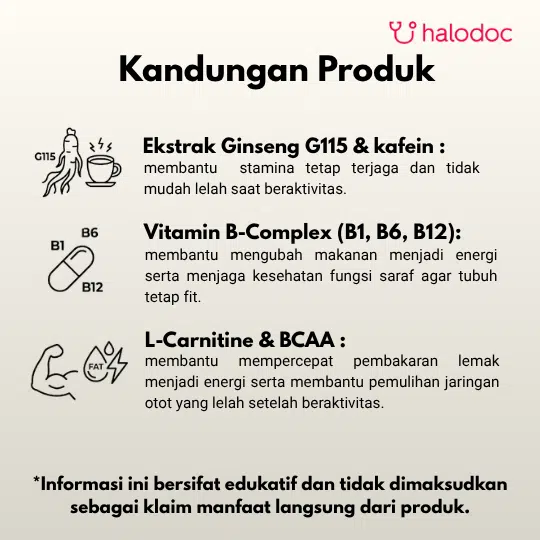 Ginseng G115, yang telah melalui berbagai studi klinis, dikenal sebagai adaptogen yang membantu tubuh beradaptasi dengan stres fisik dan mental, serta meningkatkan daya tahan tubuh. Kombinasi dengan vitamin C dan B kompleks (B1, B2, B6, B12) berperan dalam metabolisme energi, membantu mengurangi rasa lelah, dan menjaga fungsi normal sistem saraf.