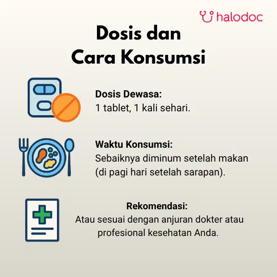 Dosis untuk dewasa adalah 1 kaplet sehari, atau sesuai petunjuk dokter atau ahli gizi.