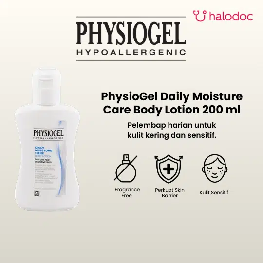 PHYSIOGEL DAILY MOISTURE CARE BODY LOTION merupakan lotion yang digunakan sebagai pelembab untuk menjaga kulit kering dan kulit sensitif. Lotion ini dapat digunakan untuk kulit sensitif di seluruh bagian tubuh termasuk wajah dan menjaga agar kulit tetap terasa lembab.