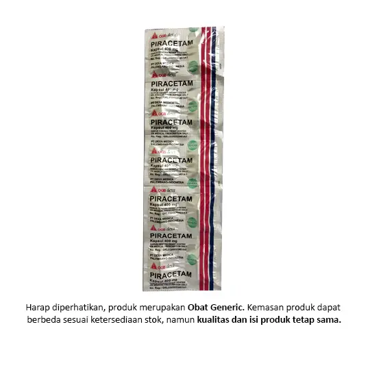 PIRACETAM 400 MG KAPLET adalah obat generik Nootropic turunan neurotransiter GABA (gamma-aminobutyric acid). Obat ini digunakan untuk meningkatkan fungsi kognitif, mioklonus serta dapat mengatasi kedutan pada otot, disleksia, vertigo dan cedera pada kepala. Piracetam mempengaruhi otak dan sistem saraf dengan melindungi korteks serebri agar tidak kekurangan oksigen. Dalam penggunaan obat ini HARUS SESUAI PETUNJUK DOKTER. Pembelian obat ini memerlukan edukasi terkait penggunaan atau pengonsumsian obat yang tepat dan aman yang akan dikenakan biaya.