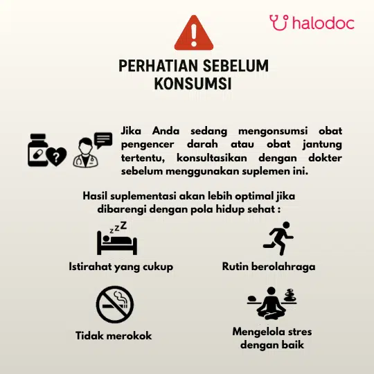 Mengandung koenzim Q10; Hati-hati pada pasien yang menggunakan warfarin dan statin. Penggunaan atas dasar anjuran dokter. Hindari penggunaan pada wanita hamil dan menyusui. Konsultasikan dengan dokter jika digunakan bersama obat lain. Tidak ada pengganti untuk diet seimbang dan bervariasi. Perawatan harus dilakukan untuk menjalani gaya hidup sehat.