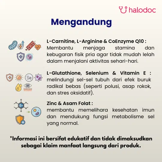 Vitamin E 72 mg, Asam folat 800 mcg, Zinc 25 mg, Selenium 60 mcg, Coenzyme Q10 15 mg, L-Carnitine 440 mg, L-arginine 250 mg, Glutathione 80 mg