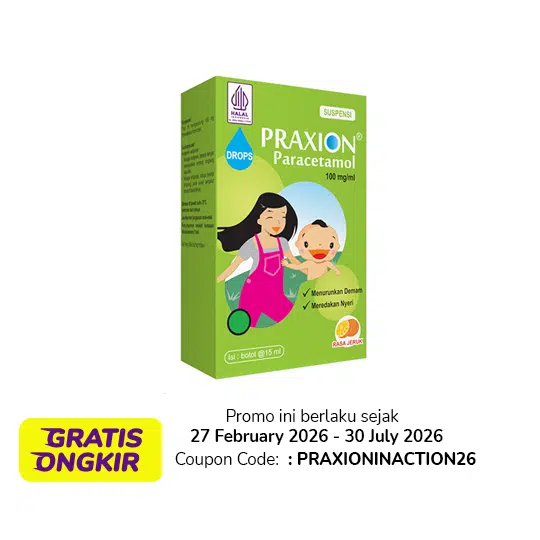 Praxion Drop adalah obat tetes ral yang mengandung Paracetamol 100 mg/ml, digunakan untuk meredakan demam dan nyeri ringan hingga sedang pada bayi dan anak, seperti demam akibat flu, tumbuh gigi, atau setelah imunisasi. Paracetamol bekerja dengan cara menghambat pembentukan prostaglandin di otak yaitu zat yang menyebabkan rasa sakit dan peningkatan suhu tubuh saat demam. Dengan kerja ini, Paracetamol membantu menurunkan panas dan mengurangi rasa nyeri secara efektif.