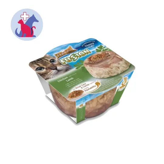 PRINCESS FUSION CHICKEN & LAMB merupakan makanan basah untuk kucing yang terbuat dari daging ayam dikombinasikan dengan daging domba. Produk makanan ini ditujukan untuk kucing yang pemilih dalam hal makanan.