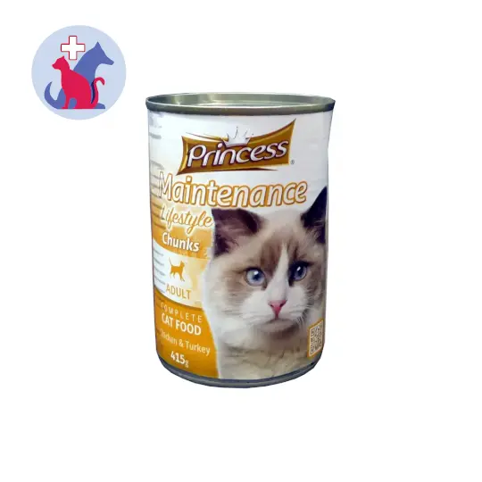 PRINCESS MAINTENANCE ADULT COMPLETE CAT FOOD CHICKEN & TURKEY merupakan makanan kucing yang terbuat dari daging ayam ditempatkan pada wadah kaleng.
