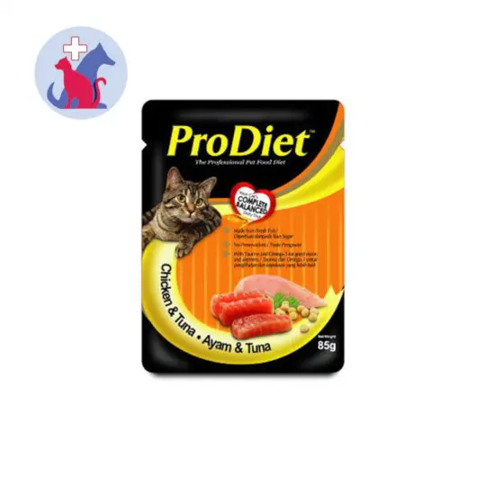PRODIET ADULT CHICKEN AND TUNA WET merupakan makanan basah khusus untuk kucing dewasa agar memenuhi kebutuhan nutrisi kucing pada setiap masa kehidupannya