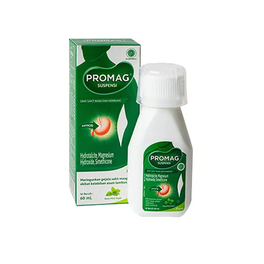 PROMAG merupakan obat sakit maag yang mengandung Hydrotalcite, Magnesium Hydroxide, dan Simethicone. Obat ini diigunakan untuk meringankan gejala sakit maag akibat kelebihan asam lambung seperti perih, mual, kembung, dan nyeri ulu hati.
