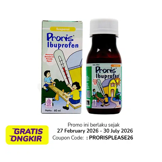 Proris Suspensi 60 ml adalah obat yang mengandung Ibuprofen 100 mg per 5 ml. Obat ini digunakan untuk menurunkan demam dan meredakan nyeri ringan hingga sedang pada anak. Bekerja dengan menghambat enzim siklooksigenase, sehingga mengurangi produksi prostaglandin yang menyebabkan gejala peradangan. Dalam penggunaan obat ini harus SESUAI DENGAN PETUNJUK DOKTER.