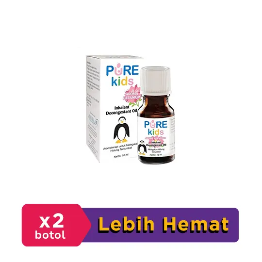 Purekids Inhalant Decongestant Oil Geranium merupakan aromaterapi dengan kandungan alami dari 6 minyak esensial berupa Eucalyptus oil, Cajuput oil, Clove oil, Juniperberry oil, Dementholised mint oil, dan Methyl salicylate yang berguna untuk membantu melegakan pilek & hidung tersumbat.