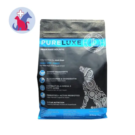 PURELUXE GRAIN FREE HOLISTIC ADULT DOG WITH TURKEY merupakan makanan anjing bebas biji-bijian untuk semua jenis dan ukuran anjing dewasa. Makanan ini terbuat dari daging kalkun dengan tambahan vitamin dan mineral yang dibutuhkan.
