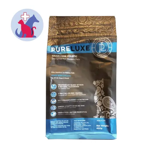PURELUXE GRAIN FREE HOLISTIC FINICKY CAT WITH CHICKEN 400 G merupakan makanan kucing bebas biji-bijian untuk semua jenis, ukuran dan usia kucing. Makanan ini ditujukan untuk kucing yang pemilih terhadap makanan.