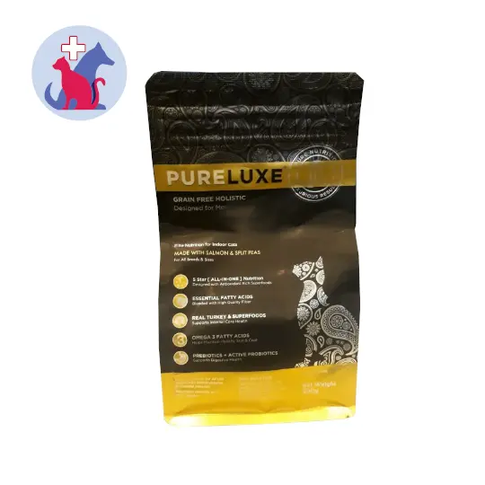 PURELUXE GRAIN FREE HOLISTIC INDOOR CAT WITH SALMON & SPLIT PEAS 400 G makanan kucing bebas biji-bijian yang cocok untuk semua jenis dan ukuran kucing rumahan yang tinggal di dalam ruangan. Makanan ini terbuat dari ikan salmon dan kacang polong.