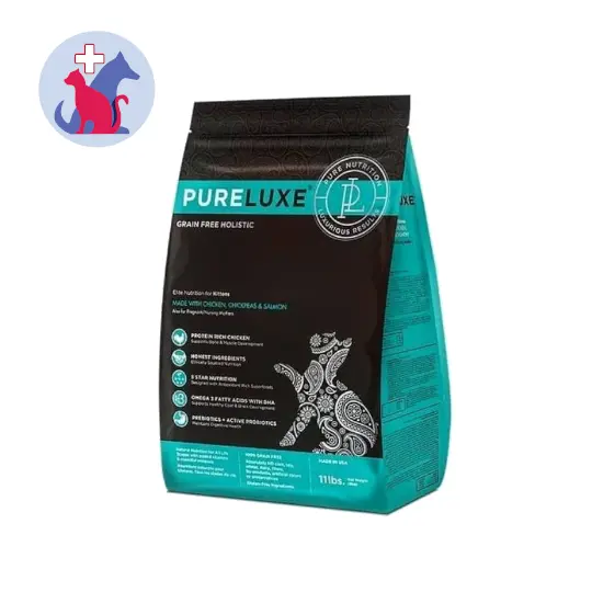 PURELUXE GRAIN FREE HOLISTIC KITTEN WITH CHICKEN, CHICKPEAS & SALMON 11 LBS (5 KG) merupakan makanan kucing bebas biji-bijian yang ditujukan untuk anak kucing. Makanan ini terbuat dari daging ayam, kacang polong, dan ikan salmon.