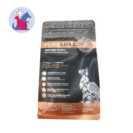 PURELUXE GRAIN FREE HOLISTIC LONG HAIR CAT WITH CHICKEN & SALMON 400 G merupakan makanan kucing bebas biji-bijian untuk kucing berbulu panjang. Makanan ini terbuat dari daging ayam dan ikan salmon.