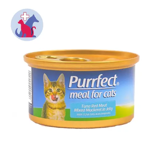 PURRFECT TUNA RED MEAT MIXED MACKEREL IN JELLY WITH SHRIMP merupakan makanan basah sehari-hari untuk kucing. Makanan ini diolah dari ikan tuna dengan kombinasi ikan kembung dan udang yang dibutuhkan untuk pertumbuhan dan perawatan kucing.