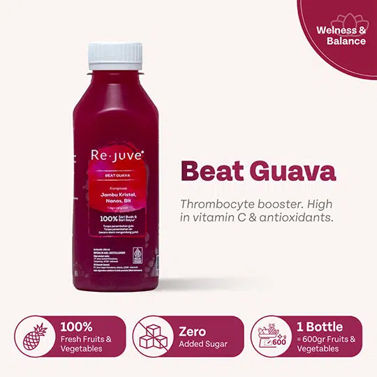 Re.juve Beat Guava 250 ml adalah minuman 100% cold-pressed juice yang terbuat dari buah jambu kristal, nanas, dan bit. Berdasarkan informasi nilai gizi, beat guava mengandung tinggi serat, Vitamin C, dan Mangan. Pilihan menyegarkan untuk asupan nutrisi harian Anda.