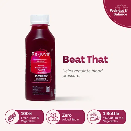 Re.juve Beat That 250 ml adalah minuman 100% cold-pressed juice yang terbuat dari buah bit, timun, nanas, dan apel. Berdasarkan informasi nilai gizi, beat that mengandung tinggi serat, Vitamin C, dan Mangan. Pilihan menyegarkan untuk asupan nutrisi harian Anda.