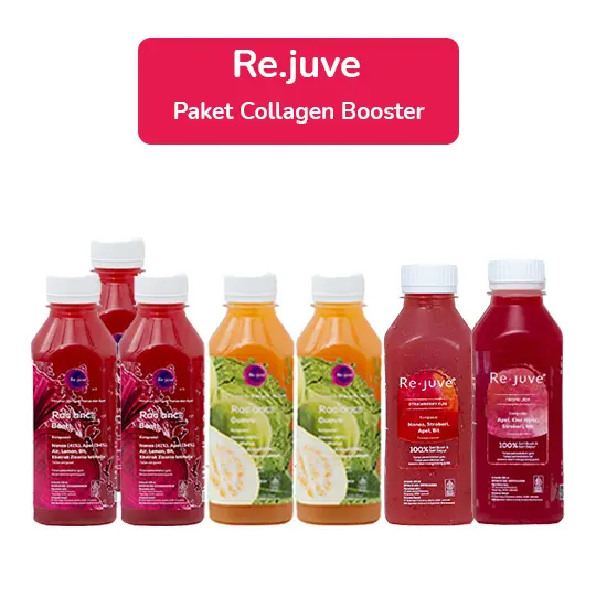 Re.juve - Paket Collagen Booster adalah Paket minuman yang dibuat dengan metode 100% Cold-Pressed Juice dan High Pressure Processing (HPP) untuk menjaga kandungan nutrisi tanpa proses pemanasan. Paket ini berisi Radiance Beet 250 ml (3 pcs), Radiance Guava 250 ml (2 pcs), Tropic Joy 250 ml (1 pcs), Strawberry Fun 250 ml (1 pcs). Paket ini merupakan pilihan yang menyegarkan dan dapat menjadi pilihan untuk melengkapi asupan nutrisi harian Anda.
