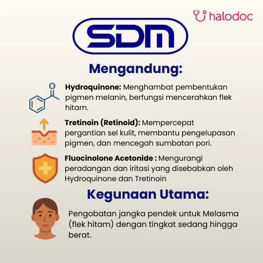 Krim kombinasi Hydroquinone 40 mg, Tretinoin 0.5 mg, dan Fluocinolone Acetonide 0.1 mg adalah obat topikal yang digunakan untuk pengobatan melasma dan hiperpigmentasi kulit. Hydroquinone bekerja dengan menghambat produksi melanin sehingga mencerahkan noda gelap, Tretinoin membantu mempercepat regenerasi sel kulit dan meningkatkan penetrasi bahan aktif lain, sementara Fluocinolone acetonide adalah kortikosteroid yang mengurangi peradangan, kemerahan, dan iritasi akibat terapi. Krim ini biasanya dioleskan tipis-tipis pada area yang bermasalah sekali sehari pada malam hari sesuai anjuran dokter. Efek samping yang dapat muncul meliputi kemerahan, kulit kering, rasa terbakar, pengelupasan, atau iritasi, sedangkan penggunaan jangka panjang dapat meningkatkan risiko penipisan kulit dan sensitivitas terhadap cahaya matahari. Krim ini tidak dianjurkan digunakan pada kulit luka terbuka, infeksi, atau pada ibu hamil tanpa pengawasan medis. Selama terapi, penting menggunakan tabir surya di siang hari dan menghindari paparan sinar matahari berlebih untuk mencegah iritasi dan memperbaiki hasil pengobatan.