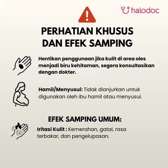 Efek samping yang mungkin terjadi dalam penggunaan obat adalah: Kulit kering, kemerahan dan mengelupas, rasa panas terbakar.