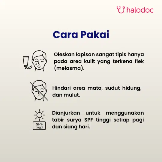 Tidak untuk terapi pemeliharaan melasma. Hindari paparan terhadap sinar matahari, kontak dengan mata, hidung, atau mulut. Penggunaan bersama dengan kontrasepsi oral