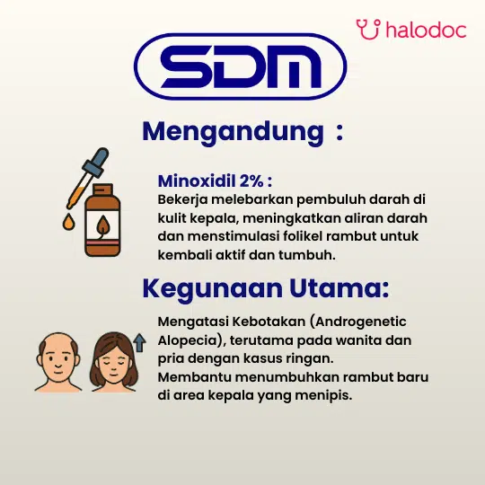 HARUS DENGAN RESEP DOKTER. Hindari kontak dengan mata, mulut, atau membran mukosa. Hentikan pemakaian jika muncul efek samping berat atau reaksi alergi. Tetap digunakan untuk menjaga hasil. Jika dihentikan, rambut bisa kembali rontok.